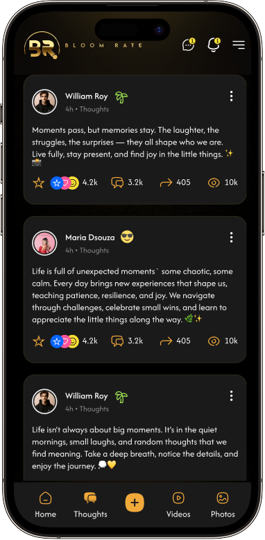 BloomRate comes packed with great features aimed to empower creators, thinkers, and everyday users who want a healthier online experience. Instead of traditional socializing, BloomRate focuses on uplifting discovery. Here, your ideas matter, your privacy is respected, and your creativity is celebrated. Connect with like-minded people who genuinely care about your passions.